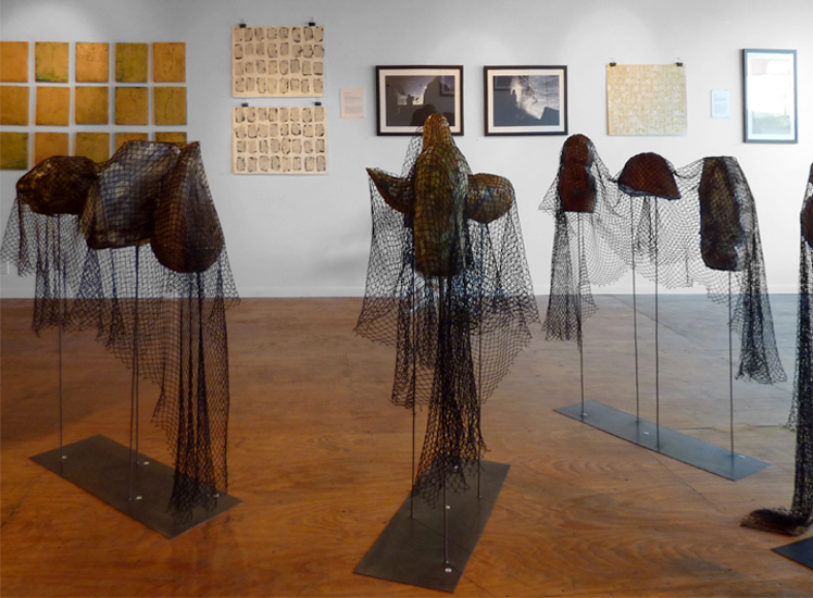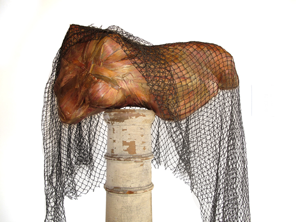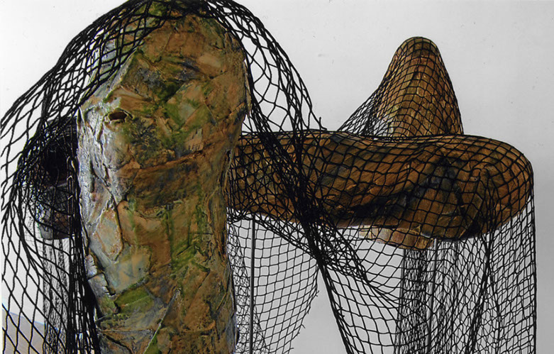 I began them during the Gulf oil spill. Entitled, "Caught", they are life sized figure fragments made of wood veneers covered by fishing nets. Once again, our uneasy relationship with nature becomes apparent: we trap and become entrapped!